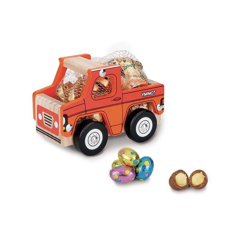 Une petite voiture en bois accompagnée d'un sachet de 100g de bouchées en chocolat au lait fourrées aux éclats de céréales.